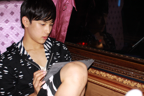 16일 오후 7시 30분 대구 코오롱 야외음악당에서 '화이팅 프로젝트' 둘째날 일정을 마무리한 제국의아이들은 편안한 모습으로 랩핑카에 탑승했다. MBC 드라마 '해를 품은 달', KBS2 드라마 '적도의 남자', MBC 시트콤 '스탠바이'에 이르기까지 '엄친아' '미친미모' 이미지로 인기를 끌었던 임시완 역시 후드 재킷에 반바지를 매치한 편안한 차림이었다. 무대 메이크업을 지운 상태인데도 잡티 하나 없는 '물광 피부'와 선명한 이목구비가 인상적이다. 그는 이동 시간에도 아이패드로 모니터링을 하며 '엄친아' 다운 면모를 뽐내기도 했다.