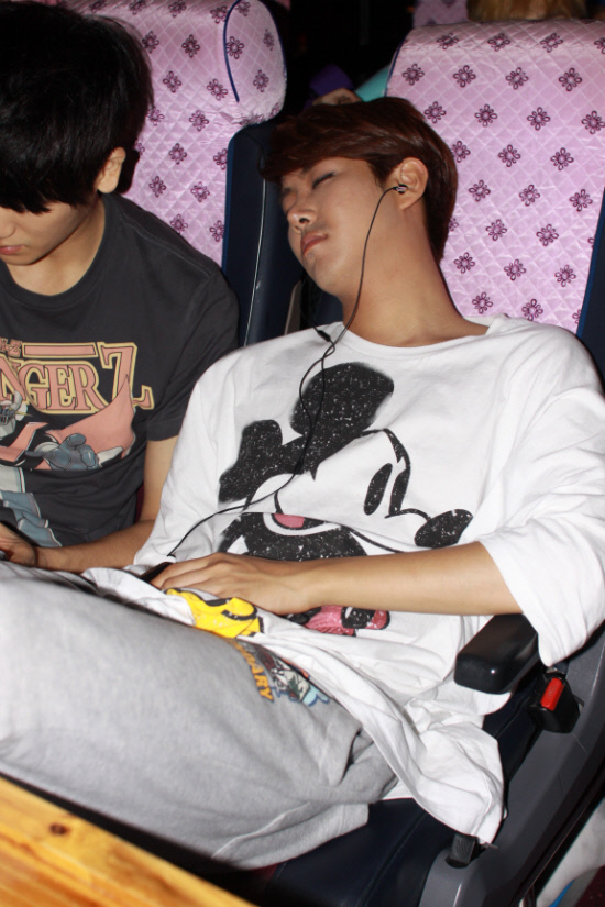16일 오후 7시 30분 대구 코오롱 야외음악당에서 '화이팅 프로젝트' 둘째날 일정을 마무리한 제국의아이들은 편안한 모습으로 랩핑카에 탑승했다. 빠듯한 일정을 소화했기 때문인지, 공연 뒤의 긴장이 풀려서인지 멤버들의 얼굴에는 지친 기색이 역력했다. 깜찍한 미키마우스 티셔츠와 트레이닝 바지를 입고 '일반인 광희'로 돌아간 황광희 역시 마찬가지. '예능돌'답게 초반에는 요들송을 부르며 분위기를 띄웠지만 이내 깊은 잠에 빠져들었다.