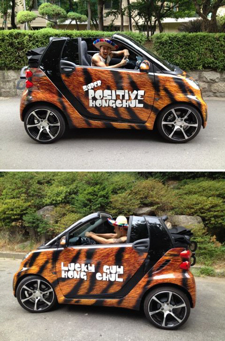 사진에는 깜찍한 디자인의 2인승 오픈카에 타고 있는 노홍철의 모습이 담겨 있다. 호피무늬로 도색된 차의 옆면에는 '슈퍼 긍정 홍철'과 '럭키가이 홍철'이라는 문구가 적혀 있어 한 눈에 봐도 노홍철의 차임을 알 수 있게 꾸며졌다.
