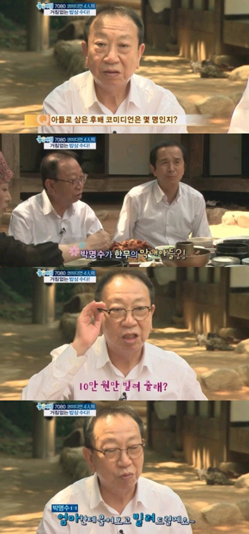 이어 그는 "신인이었던 박명수에게 '10만원만 빌려 줄래?'라고 물었더니 '엄마한테 물어보고 빌려 드릴게요' 라고 했다"며 재치 넘친 박명수의 답변에 반해 그를 아들로 삼게 됐다고 밝혔다.