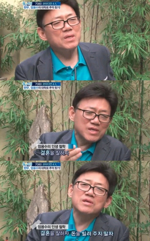 뒤이어 엄용수는 자신의 인생철학이 "결혼을 잘하자와 돈을 빌려주지 말자"라고 밝혀 웃음을 자아내기도 했다. <스포츠조선닷컴>