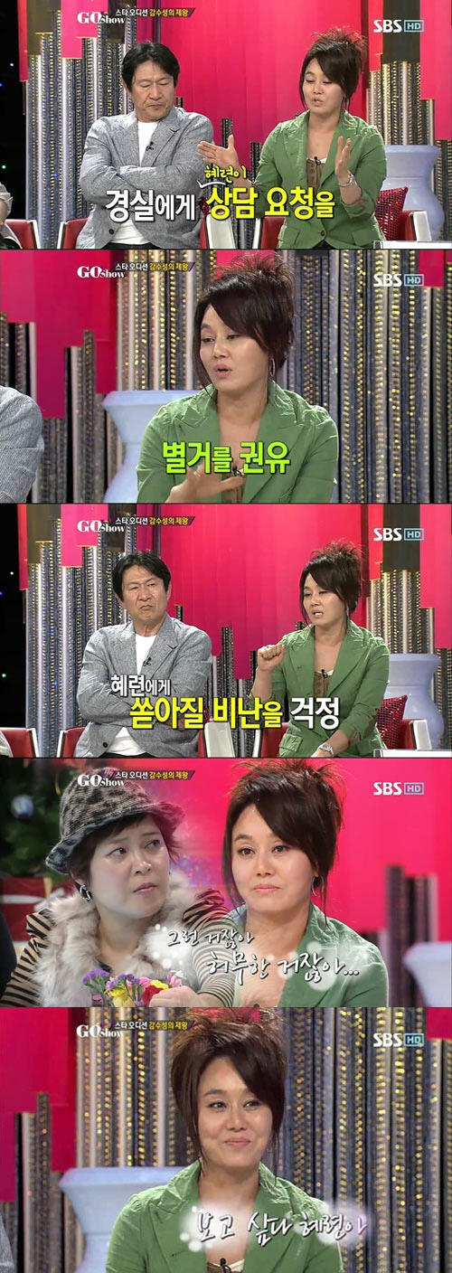 지난 22일 방송된 SBS '고쇼'에 출연한 이경실은 "평소 여자 후배들의 상담을 많이 해주는 것으로 알고 있다"라는 MC들의 말에 "가슴 아픈 친구가 있다"라며 이혼 후 활동을 중단한 조혜련을 언급했다.