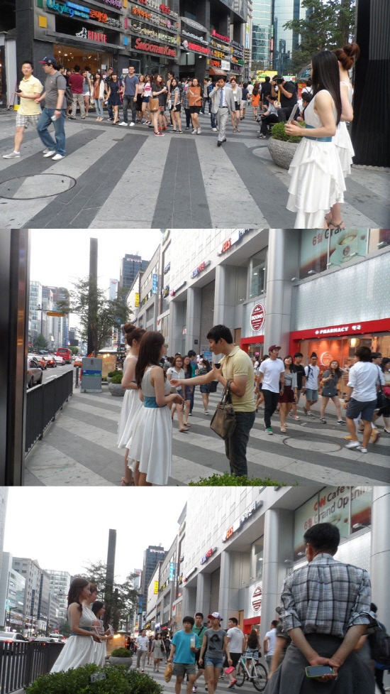 여성스러운 흰 원피스를 차려입은 미모의 여성 3명이 나란히 선 채로 아이패드를 들고 있어 행인들의 이목을 집중시켰다.