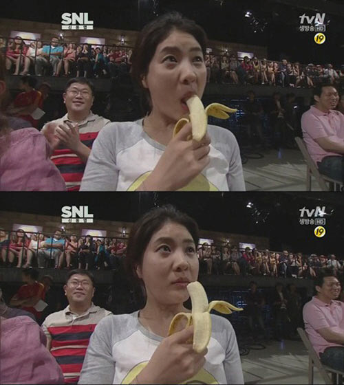 이 모습을 본 신동엽은 잠시 웃더니 "바나나는 빨아먹는 과일이 아니다. 반드시 깨물어 먹어야 한다"며 지적했고 강유미는 멋쩍은 표정을 지으며 바나나를 내려놓았다.
