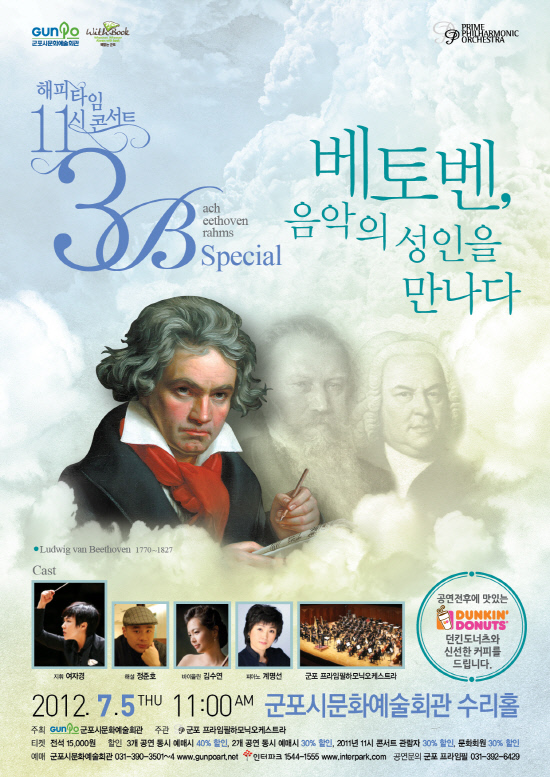 군포시문화예술회관과 프라임필하모닉오케스트라가 7월 5일 2012해피타임 11시 콘서트 두번째 무대를 연다. 바흐(Bach), 베토벤(Beethoven), 브람스(Brahms) 등 3B 스페셜 시리즈의 두번째 시간으로 베토벤 편이다.