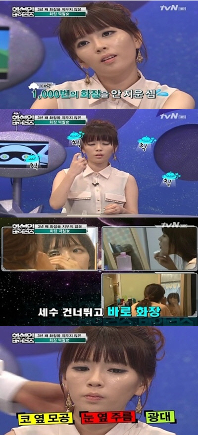 이에 MC들이 "단 한 번도 화장을 지운 적이 없냐"고 묻자 그는 "화장을 1,000번 했는데 한 번도 안 지운 거다"라고 당당하게 답했다. 이어 "(화장이)두꺼워지는 느낌을 받지 못했다. 다음날 되면 흡수 돼서 사라지니까 괜찮다"고 덧붙였다.