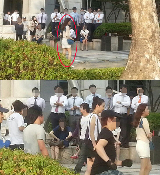 특히 촬영장 주위에는 정장 차림의 '넥타이 부대' 회사원들이 늘씬한 각선미와 환상적인 몸매를 뽐내고 있는 김하늘의 모습을 넋을 논 채 바라보고 있어 눈길을 끈다.