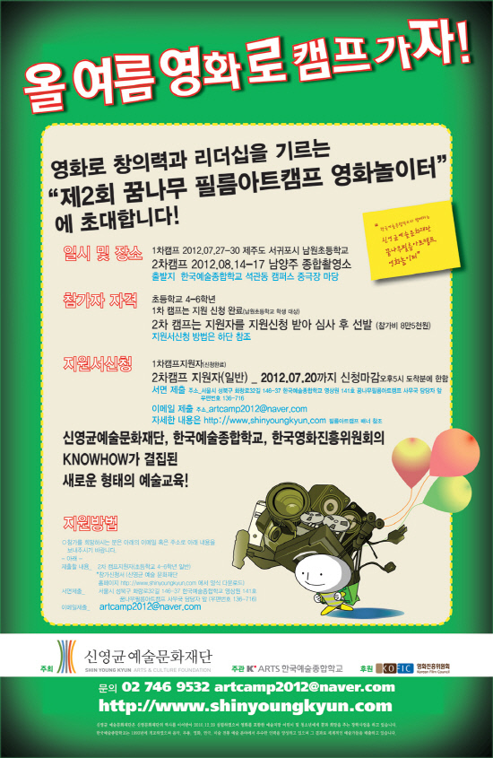 신영균예술문화재단(이상장 안성기)은 "여름방학을 이용한 어린이 영화학교인 2012년 제2회 꿈나무 필름아트캠프를 7월 27일부터 30일까지 제주도 남원에서, 8월 14일부터 17일까지 남양주종합촬영소에서 두 차례 주최, 운영한다"고 밝혔다.