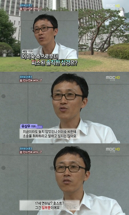 이날 방송에서 피소된 기자 중 한 명은 "전체적으로 정황을 보면 '이미숙이 (고 장자연이 남긴 문건에)개입을 했다'라는 추측을 한 거지 이걸로 소송을 했다는 것은 말이 안된다"며 "그 정도 의혹도 제기하지 못한다면 기자생활 하지 말아야한다"고 밝혔다.