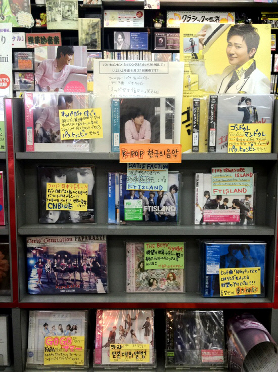 일본 도쿄의 한 레코드 숍 내부를 촬영한 이 사진에는 한국 최고 인기 가수들을 제치고 K-POP 코너 가장 위를 장식한 박현빈의 신보 이미지와 문구가 확 눈에 띈다. 멀리서 봐도 한눈에 들어올 정도의 크기로, 소녀시대와 동방신기, 카라, 씨엔블루 등의 음반이 모두 그 아래에 진열되어 있는 모습은 생소하다 못해 다소 충격적이기까지 하다.