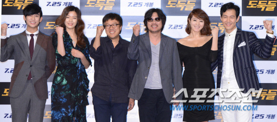 영화 '도둑들'(감독 최동훈)의 언론시사회가 10일 오후 왕십리 CGV에서 열렸다. '도둑들'은 마카오 카지노에 숨겨진 희대의 다이아몬드 '태양의 눈물'을 훔치기 위해 중국과 한국 최고의 도둑들이 팀을 이뤄 펼치는 범죄 액션 드라마다. 최동훈 감독과 배우들이 포토타임을 갖고 있다. 최문영 기자 deer@sportschosun.com /2012.07.10/