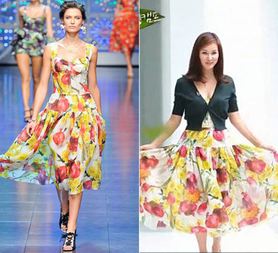 고소영과 모델이 착용한 이 원피스는 가슴선이 살짝 파이고, 큼직한 붉은 양파와 꽃무늬가 인상적인 화려한 디자인. 명품 브랜드 D사의 제품으로 2012 S/S 컬렉션이며 가격은 약 400만원인 것으로 밝혀졌다.