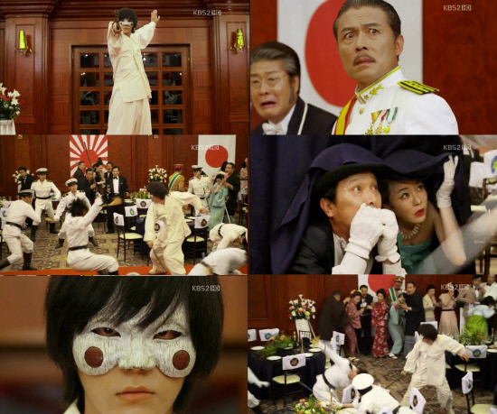 지난 11일 방송한 '각시탈'에서는 각시탈(주원)이 폭탄을 터뜨리려는 계획에 실패한 담사리(전노민)을 대신해 한일합방식을 습격하는 과정이 그려졌다. 이를 저지하려는 제국경찰들을 차례로 물리치고 '경축, 일한합방 이십이주년(慶祝, 日韓合邦 二十二周年)'이라고 써진 현수막을 시원하게 베어버렸다.