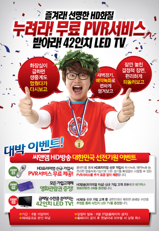 수도권 최대 케이블TV 방송사 씨앤앰(cable & more)이 런던올림픽이 끝나는 8월 12일까지 '씨앤앰HD방송 대한민국 선전기원 이벤트'를 진행한다.