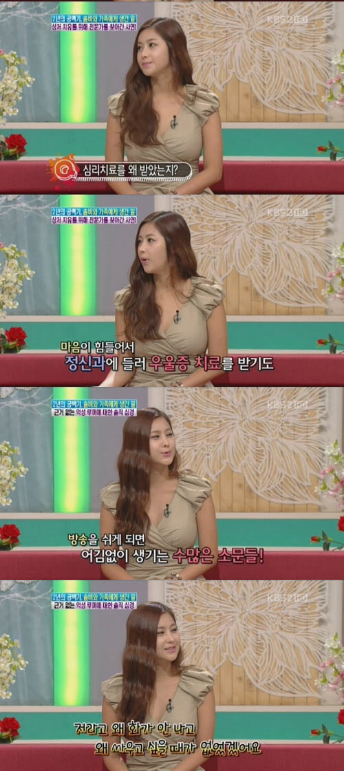 이날 방송에서 솔비는 "내가 너무 힘들어하니까 주변에서 정신과 치료를 받아보라고 권해주더라"라며 "그래서 정신과를 찾아가서 우울증 치료를 받고 쉬는 동안 심리치료를 꾸준히 받았다"라고 밝혔다.