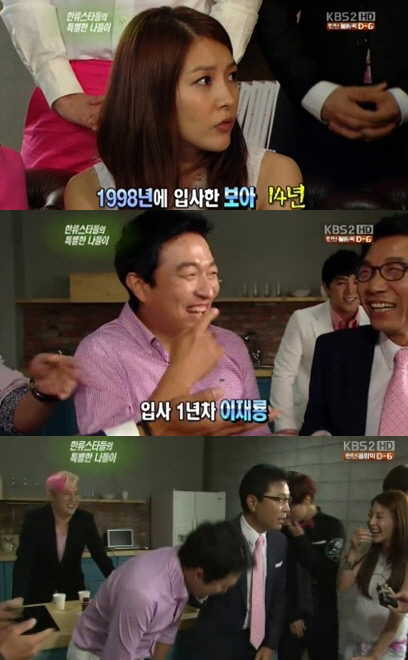 21일 방송된 KBS2 '연예가중계'에서는 SM 소속 스타들이 한 자리에 모인 현장이 비춰졌다. 이날 배우 윤도훈과 개그맨 홍록기 등은 입사 시기를 따져 SM내 선후배 서열을 정리했다. 이들은 이재룡이 SM 입사 1년차라는 사실을 언급하며 보아와의 인사를 주선하고 나섰다. 이재룡과 보아는 각각 47세와 25세로 22세 차이가 나지만, 입사 년차로는 1998년도에 SM에 들어온 보아가 한참 선배였던 것.