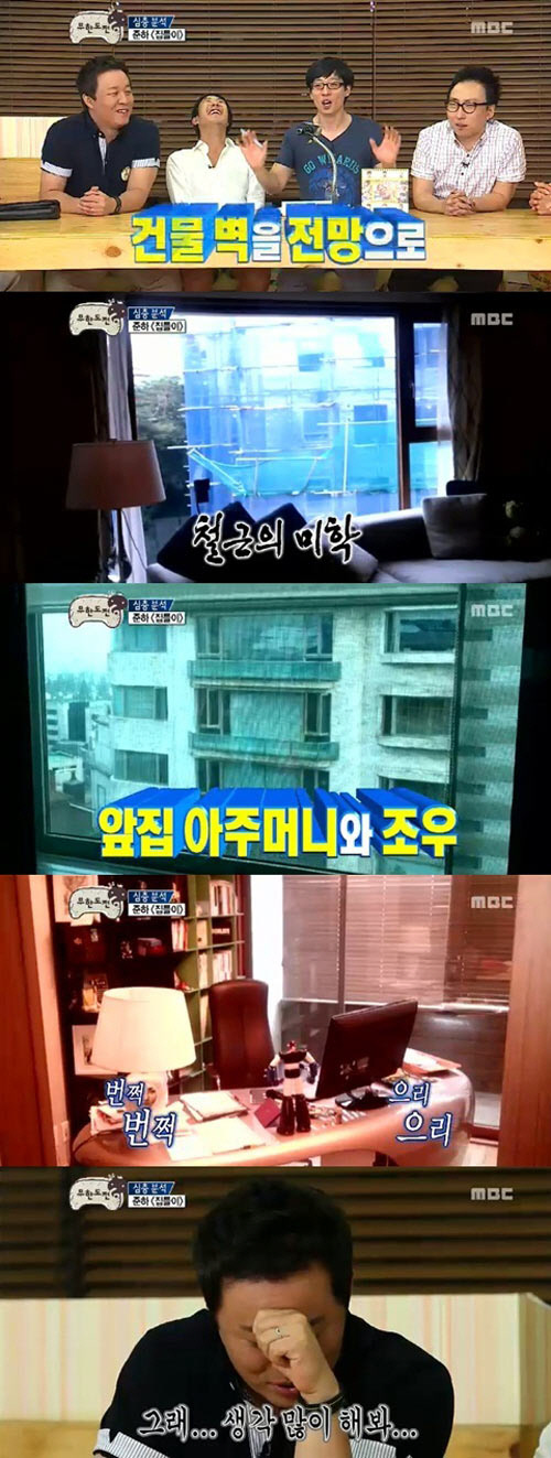 이에 박명수가 "(노)홍철이가 반대편은 괜찮겠지 싶어서 창문을 열었는데 앞집 아줌마하고 눈이 마주쳤다"고 밝혀 웃음을 자아냈다.