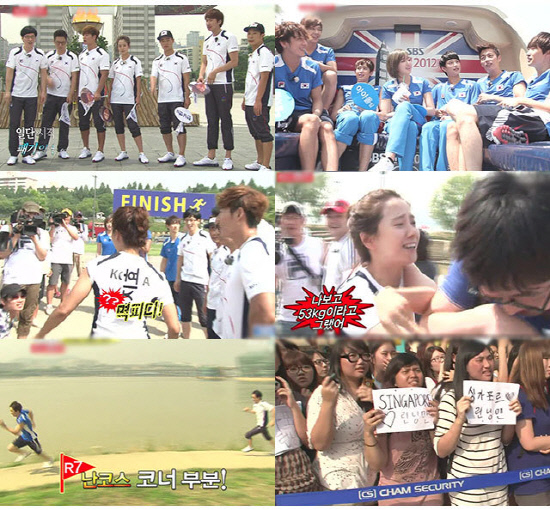 런던 올림픽 기원 <일요일이 좋다 런닝맨>에는 아이돌 중에서도 체력적인 면과 기술적인 면이 뛰어난 아이돌이 총출동을 했다. 2PM의 닉쿤, 슈퍼주니어의 은혁, 비스트의 윤두준, 씨앤블루의 정용화, 엠블랙의 이준, 제국의 아이돌 임시완. 그리고 티아라의 은정까지 유명한 아이돌 그룹의 멤버들이 출연을 한 것은 많이 있는 일은 아녔다.