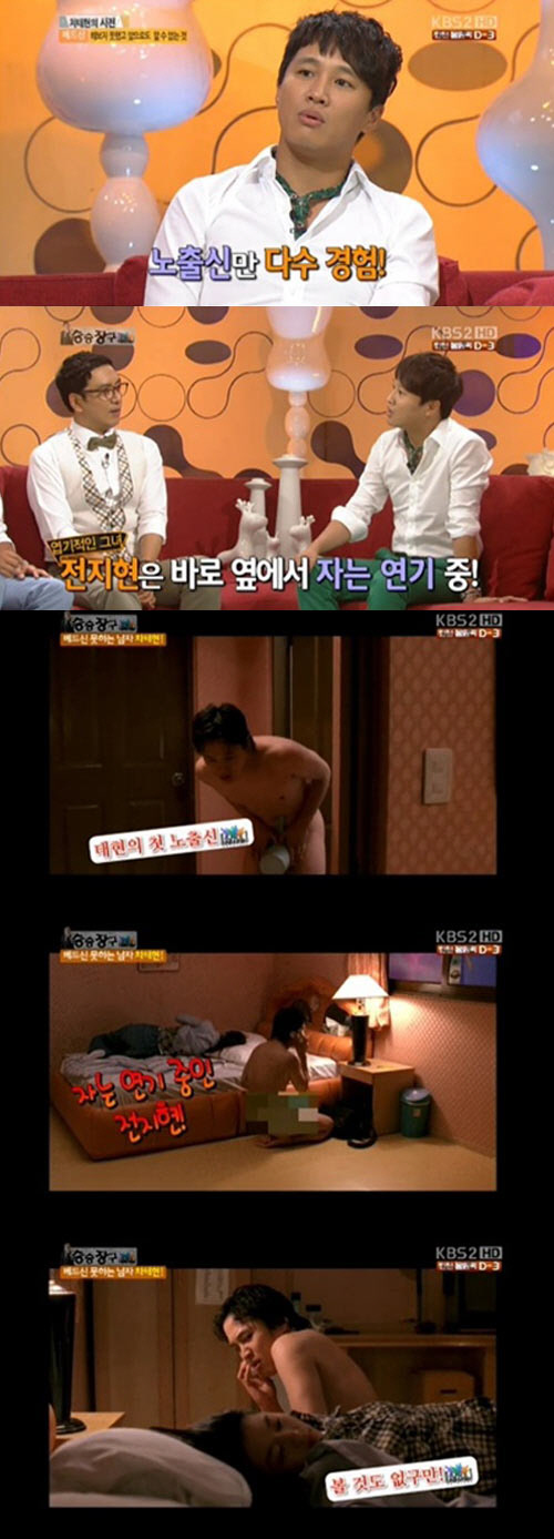 차태현은 "당시 바가지 하나를 들고 카메라 앞에 섰다"며 "노출신 혹은 베드신을 앞두고는 주요 부위를 가리는 공사가 보통은 있지만 난 제안도 못 받았다"고 전해 충격을 줬다.