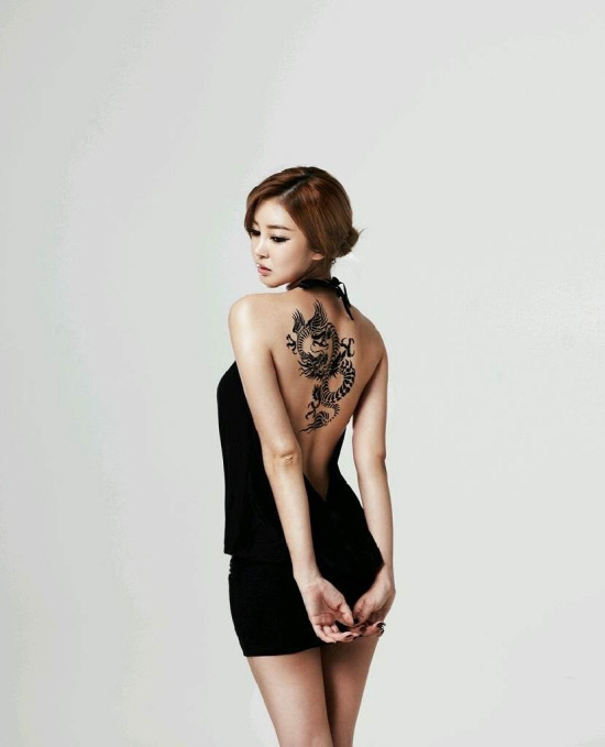 온라인 커뮤니티 게시판을 통해 공개된 이 사진은 최근 용온라인 게임의 공식홍보모델 촬영 때의 직찍 사진으로 NS윤지의 매끄러운 등라인에 선명하게 새겨진 용문신이 눈길을 끌고 있다. 특히 목라인에서 일자로 내려오는 등라인과 섹시한 블랙 미니원피스와 용문신은 관능미마저 느끼게 만들며 굴욕 없는 원조 S라인의 소유자임을 입증하고 있다.