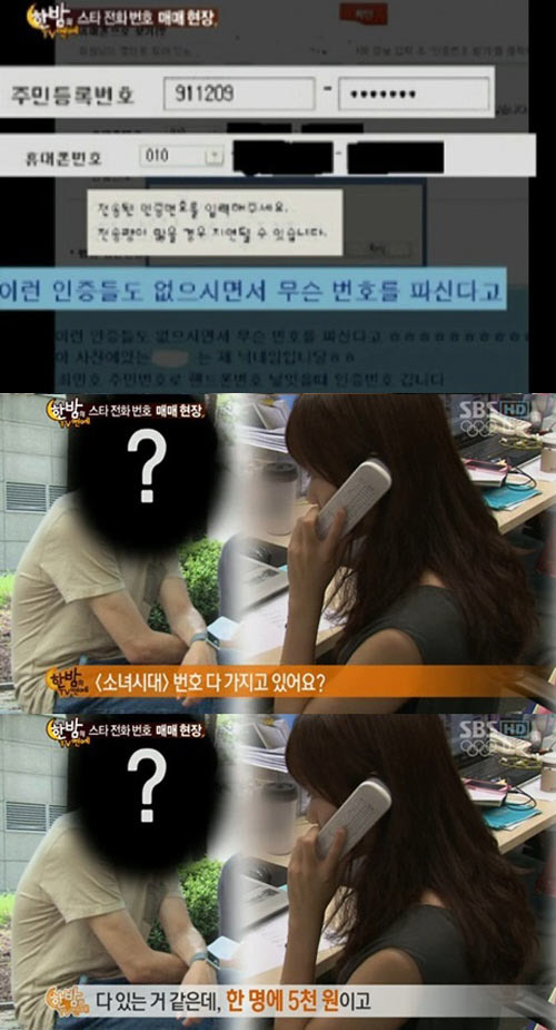 제작진이 인터넷에서 전화번호를 판매하고 있는 판매자와 접촉해 소녀시대 번호에 대해 물어보자 판매자는 "다 있다. 소녀시대의 경우 멤버 당 전화번호가 5000원이다"라고 밝혔다.