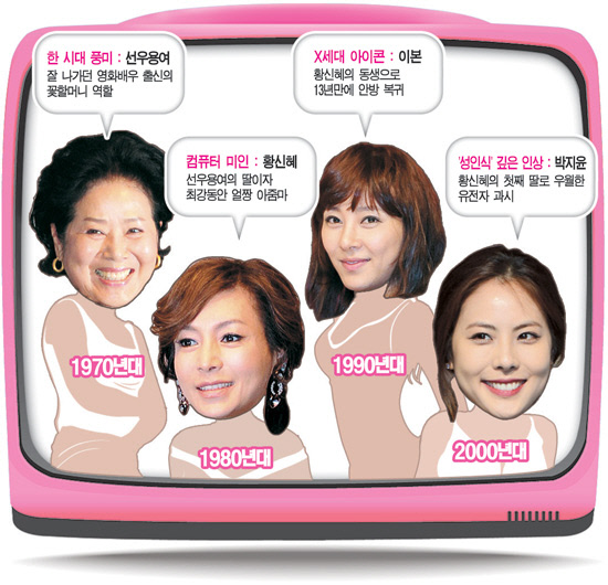 다음 달 중순 첫 방송을 예고하고 있는 KBS2 일일 시트콤 '닥치고 패밀리'는 세대별 한국의 대표 미인들이 총출동해 벌써부터 관심을 모으고 있다. 실제로 공교롭게도 이번 시트콤에는 70년대부터 현재까지 대한민국 미모의 표본이라고 할 수 있는 미녀들이 출연을 예고하고 있어 뭇 남심을 흔든다. 이들은 시트콤에서 우성가족으로 등장해 불꽃튀는 연기대결을 펼칠 예정이다.