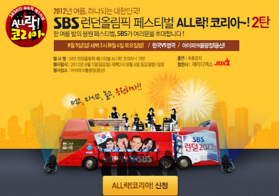 SBS는 오는 5일 오전 3시 30분(한국시간)에 열리는 올림픽 축구 대표팀의 영국전 8강 경기를 맞아 스위스전에 이어 두 번째로 '올(ALL)락! 코리아' 행사를 개최한다.