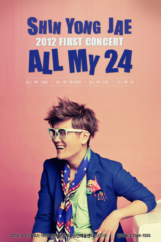 신용재는 9월 13일 부터 16일까지 4일간 대학로 동덕여대 공연예술센터에서 첫 솔로 단독 콘서트 '올 마이 24'를 개최한다. 그는 '올 마이 팬, 올 마이 프렌즈, 올 마이 걸, 올 마이 24'라는 부제 하에 팬 친구 여자 24세의 신용재를 주제로 1인 4색 콘서트를 펼칠 예정이다. KBS2 '불후의 명곡2'에서의 인기를 바탕으로 지난 3월 포맨의 단독 공연과 7월 에일리 임정희 이정과 함께한 '보이스4 콘서트' 등을 통해 공연형 아티스트로서의 면모를 입증한데다, 첫 솔로앨범 '24' 역시 뜨거운 반응을 얻고 있어 기대를 높이고 있다.