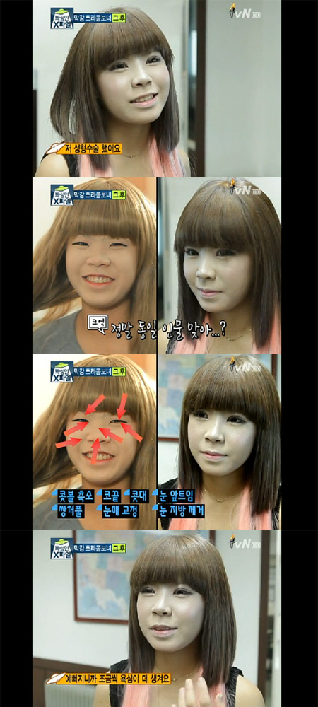 한층 성숙해진 외모로 섹시미까지 더해진 모습의 박 씨는 "콧볼 축소, 코끝, 콧대, 눈 앞트임, 쌍꺼풀, 눈매 교정, 눈 지방제거를 하는 성형수술을 했다"고 고백했다. 이어 "성형수술한 지 이제 2주 넘었다. 지금도 마음에 들고 만족하긴 하는데 예뻐지니까 조금씩 욕심이 더 생긴다"고 밝혔다.