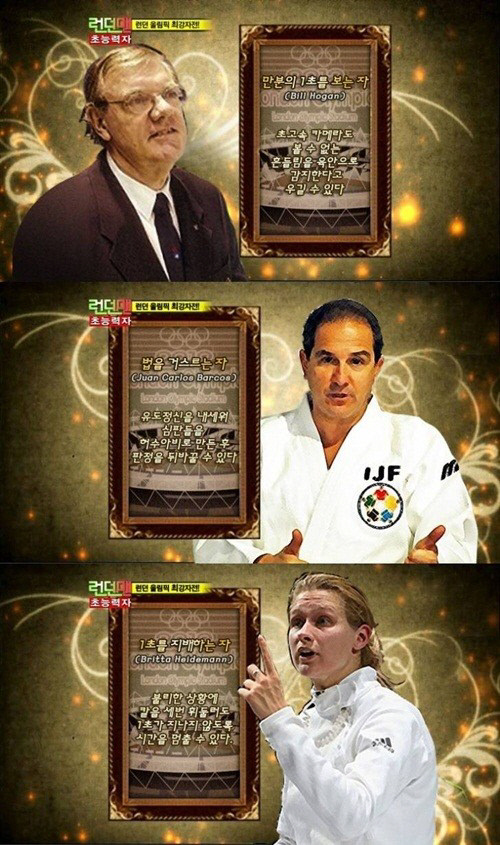 수영의 박태환, 유도의 조준호, 펜싱의 신아람 등 한국 대표팀 선수들에 대한 석연치 않은 판정이 이어지자 네티즌들은 속상한 마음을 대신해 갖가지 패러디물을 만들어냈다. 그 중 SBS '일요일이 좋다-런닝맨'의 에피소드를 패러디한 '올림픽의 초능력자들'이라는 게시물이 단연 눈에 띈다. '만분의 1초를 보는 자', '법을 거스르는 자', '1초를 지배하는 자' 등의 문구는 그야말로 의미심장하게 다가온다.
