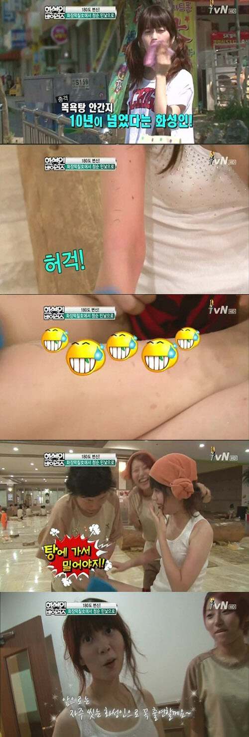 목욕탕에 도착한 '화장떡칠녀'는 물을 묻히지도 않은 채 목욕관리사가 때밀이 수건으로 몸을 살살 문지르기 시작하자마자 이내 수많은 때들이 밀려나와 모두를 민망하게 했다.