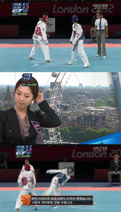 9일 오전 KBS1에서는 런던 엑셀 사우스 아레나에서 열린 '2012 런던올림픽 태권도 남자 58㎏급 준결승전' 대한민국 이대훈 대 러시아의 데니센코 경기를 중계 방송했다.