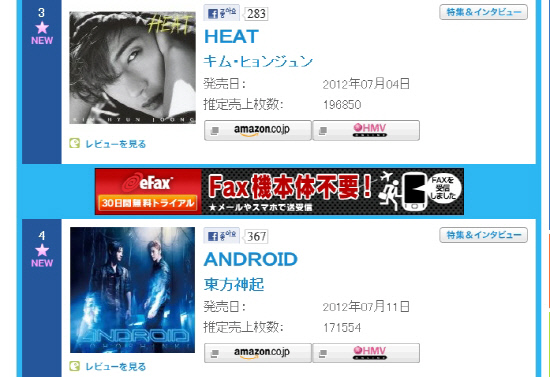 김현중과 동방신기는 7월 오리콘 월간 차트 3위와 4위에 나란히 안착해 눈길을 끌었다. 먼저 김현중은 7월 4일 발표한 두번째 싱글 앨범 '히트'가 19만 6850장의 판매고를 올리면서 월간 차트 3위에 올랐다. 이번 앨범은 발매 첫날 약 14만 장이 판매되며 오리콘 데일리 차트 1위에 오른 데 이어, 발매 첫 주에는 18만 3000장의 판매고를 기록하며 오리콘 위클리 차트 1위를 차지한 바 있다.