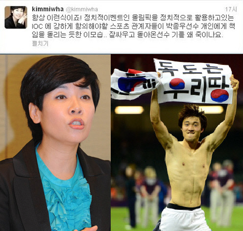 김미화는 지난 12일 자신의 트위터에 "항상 이런 식이죠! 정치적 이벤트인 올림픽을 정치적으로 활용하고 있는 IOC에 강하게 항의해야할 스포츠 관계자들이 박종우 선수 개인에게 책임을 돌리는 듯한 이 모습. 잘 싸우고 돌아온 선수기를 왜 죽이나요"라며 스포츠 관계자들의 행동에 일침을 가했다.