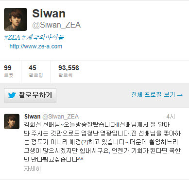 이 소식을 접한 시완은 자신의 트위터에 "김희선 선배님~오늘 방송 잘 봤습니다!! 선배님께서 절 알아봐 주시는 것만으로도 엄청난 영광입니다. 전 선배님을 좋아하는 정도가 아니라 애정(?)하고 있습니다~ 더운데 촬영하느라 고생이 많으시겠지만 힘 내시고요, 언젠가 기회가 된다면 꼭 한번 만나 뵙고 싶습니다"라는 글을 게재했다.