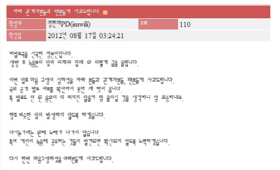 이어 정현재PD는 공개 게시판을 통해 "미발표곡을 선곡한 장본인이다. 이번 일로 마음 고생이 심하셨을 카라와 관계자, 팬분들께 사과드린다. 곡 공개 발표 여부를 확인하지 못한 제 탓이 크다. 곡 발표도 안된 음원이 더 퍼지진 않을까 맘 졸이실 것을 생각하니 참 죄송하다. 향후 비슷한 일이 발생하지 않도록 노력하겠다. 혹여 개인이 녹음해 공유하는 것들이 발견되면 확산하지 않도록 노력하겠다"는 사과문을 게재했다.
