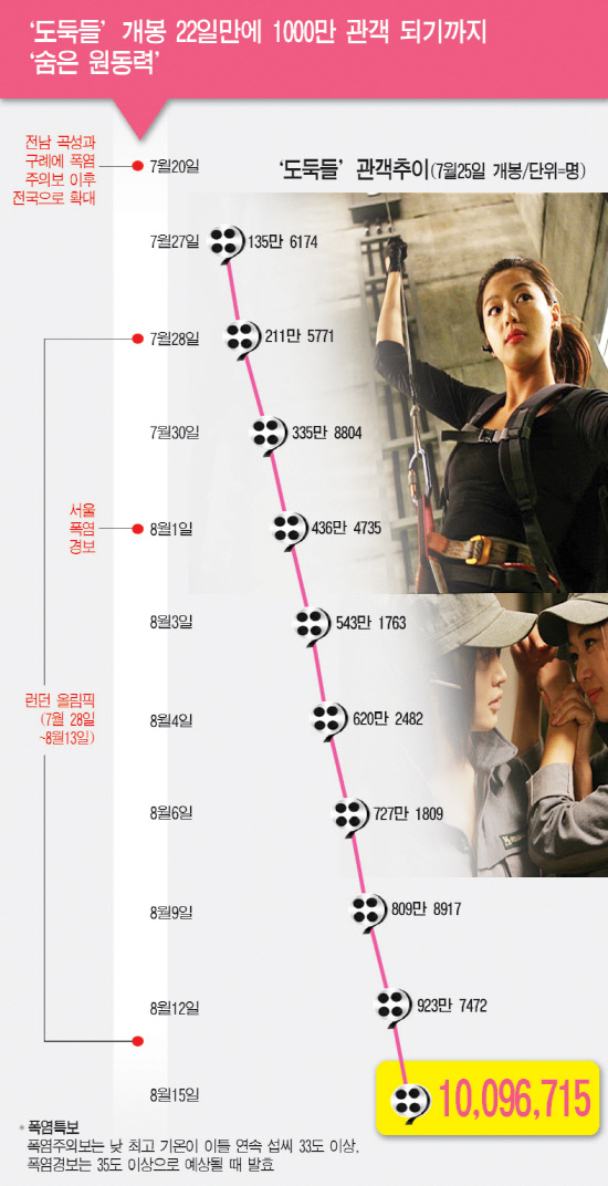 '도둑들'의 흥행 역시 폭염 덕을 톡톡히 본 것으로 보인다. 시민들이 시원한 극장으로 피서를 나서면서 전체 관객수가 늘었다. 폭염 외의 다양한 요인이 작용한 결과지만, 올해 7월 총 관객수(2096만 2907명)는 지난해 7월 총 관객수(1833만 3347명)보다 262만 9560명이 많았다.