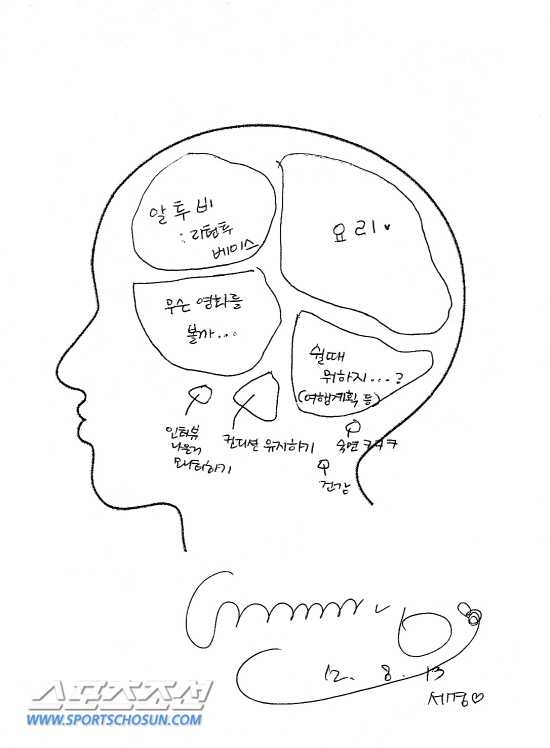 신세경의 뇌구조엔 '쉴 때 뭐하지?', '컨디션 유지하기', '숙면', '건강' 등 휴식이나 몸상태와 관련된 것들이 유독 많다는 점도 눈에 띄었다. "작품을 연달아 하느라 너무 오랫동안 못 쉬어서"라고 했다. 신세경은 '지붕 뚫고 하이킥', '뿌리깊은 나무', '패션왕' 등을 통해 쉴 틈 없이 활동을 이어왔다. 그녀의 건강 유지법은 헛개 음료 마시기. 곁에 놓인 헛개 음료를 한 모금 들이킨 신세경은 "신체가 지치니까 여러가지로 악역향을 미치더라고요. 최대한으로 내 에너지를 갖고 일하고 싶어요"라고 말했다.