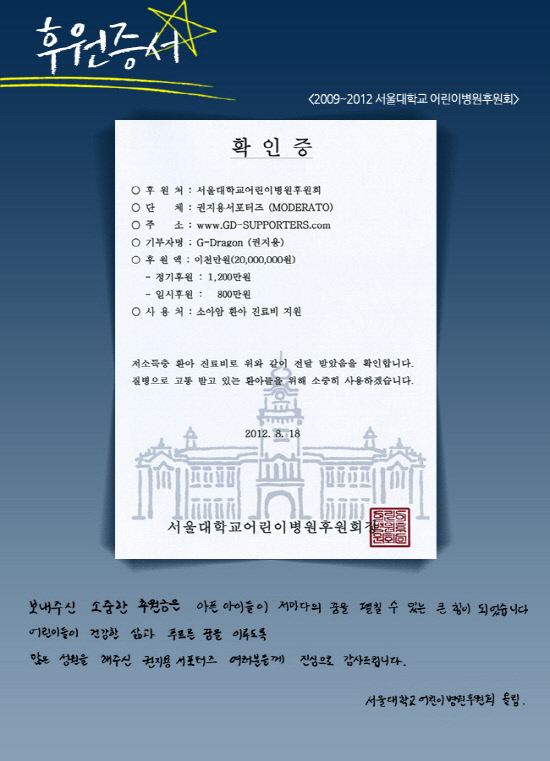 지드래곤 팬덤인 권지용 서포터즈 내 어린이 후원 단체 모데라토는 올해 총 기부액 1억 원을 달성했다. 이들은 2008년부터 해외 어린이 양육비 후원, 중학생 교육비 후원, 희귀병 환아 치료비 후원, 션 '만원의 행복' 어린이 재활병원 건립기금 기부, 콘서트 드리미 기부, 네이버 해피빈 기부, 아이티지진 긴급 구호기금 기부, 공부방 지원, 빈곤가정 피학대 아동 후원 등의 활동을 진행해왔다. 2008년~2009년 1657만 원, 2009년~2010년 2643만 2700원, 2010년~2011년 3372만 2630원을 기부했고 올 한해 서울어린이병원 희귀병 환아와 소아암 환자 치료비 2000만 원, 소외된 아동학대 보호센터 및 아동 성폭력 보호기관에 100만 원을 기부하면서 기부금 1억 원을 돌파한 것.
