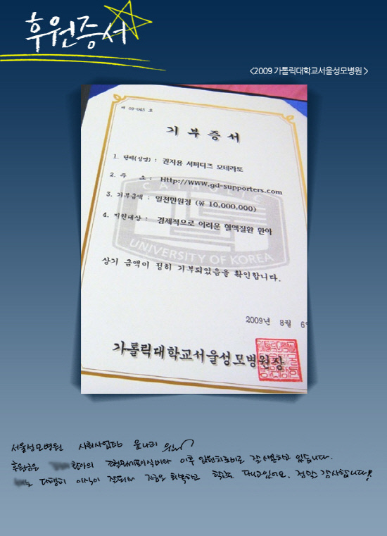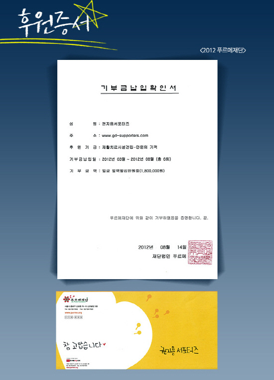이에 지드래곤은 "대단하십니다! 멋있다 예쁘다 사랑스럽다 멋지다 장하다 귀엽다 매력적이다. 앞으로도 좋은 일 많이 해요 우리. 든든하다. 기분좋다. 행복하다"는 자필 편지를 보내 훈훈함을 더했다.