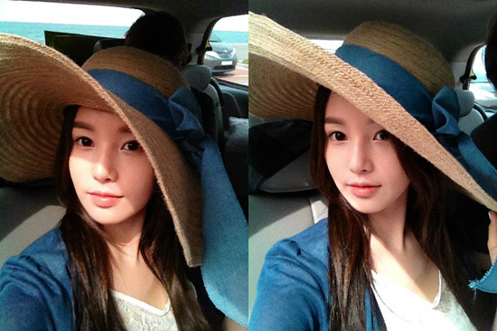 남규리는 큰 파란 리본이 달린 비치 모자를 쓰고 가슴부분이 시스루인 티셔츠를 입고 청순미를 뽐내고 있다.