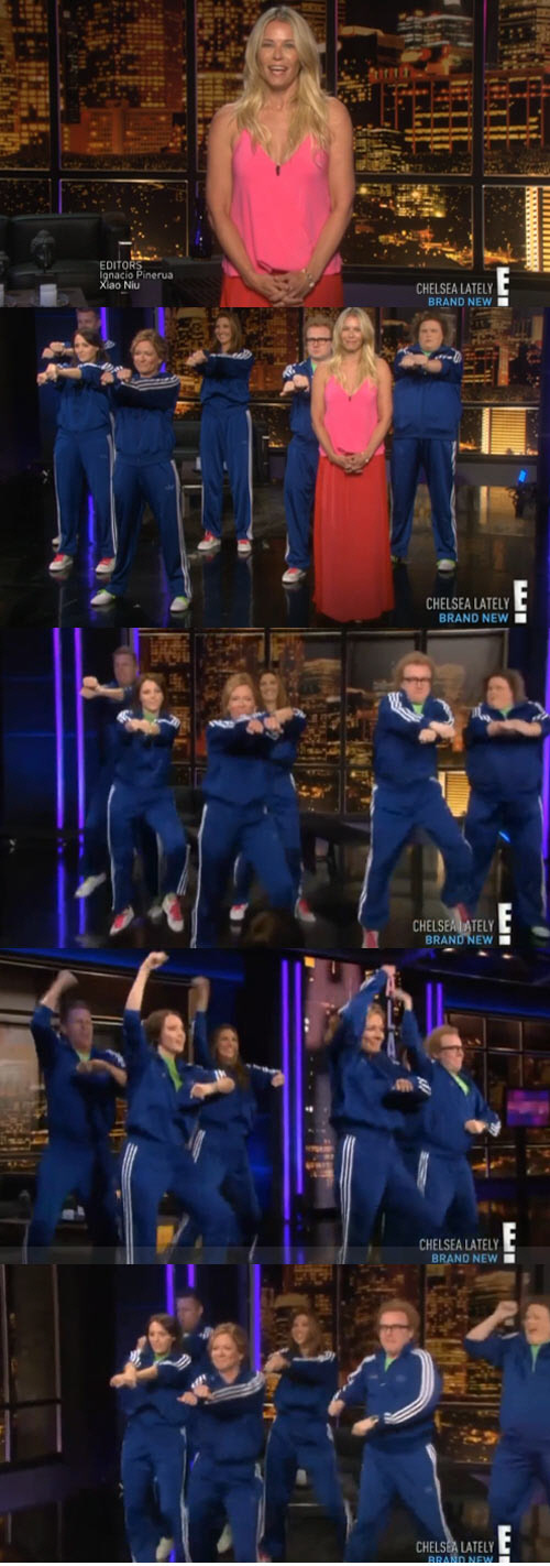 뮤직비디오 자료 화면이 나간 후에는 여러 명의 스태프들이 '강남스타일' 음악에 맞춰 신나게 춤을 췄다. 첼시 핸들러가 한국어로 "오빤 강남 스타일!"을 외치자 파란색 삼선 추리닝을 입은 스태프들이 단체로 '강남스타일'의 하이라이트 동작인 '말춤'을 흥겹게 춰 웃음을 자아냈다.