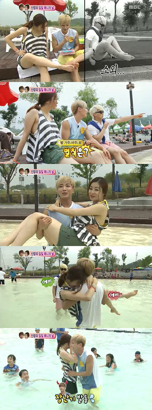 이특과 강소라의 스킨십은 물속에서도 이어졌다. 이특은 '멀리 서 있는 안전요원과 하이파이브 하고 오기'를 벌칙으로 걸은 묵찌빠 게임에서 진 강소라를 "내가 안고 다녀오겠다"며 번쩍 들어올렸다.