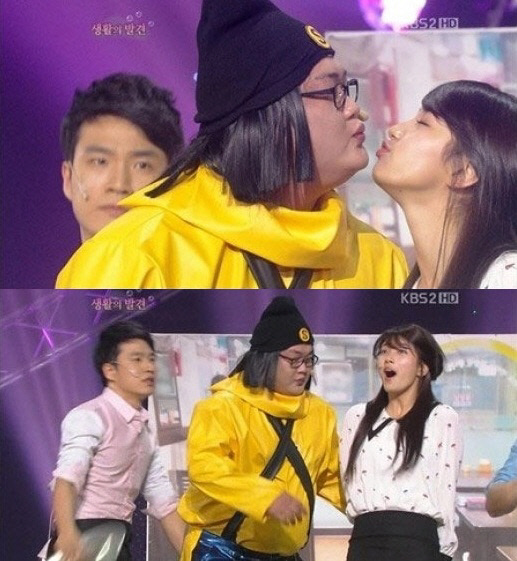 이에 앞서 26일 방송한 KBS2 '개그콘서트-생활의 발견'에서는 송준근의 새 여자친구로 수지가 등장했다. 수지는 "다른 남자가 생겼다"며 김준현을 불렀고, 수지와 김준현이 서로 입술을 내밀며 키스하려고 하자, 종업원 역의 김기리가 쟁반으로 김준현의 머리를 내려쳤다. 이에 깜짝 놀란 수지를 보며 김준현은 고개를 떨궈 눈길을 끌었다.