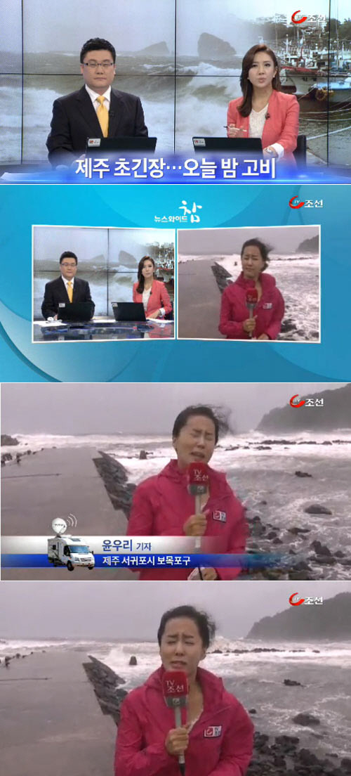 태풍 '볼라벤'의 북상으로 전국이 비상에 걸린 가운데 여기자의 투혼이 네티즌들의 주목을 받고 있다.
