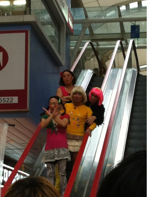 사진에는 경기도 일산 웨스턴돔에서 촬영에 한창인 '무한도전' 멤버 박명수, 길, 유재석, 정준하의 모습이 담겨 있다. 일본 갸루족을 연상케 하는 파격적인 여장을 한 채 나란히 에스컬레이터를 타고 내려오는 이들의 모습은 경악 그 자체.