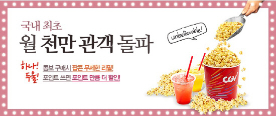 CGV는 8월 한 달간 국내 최초로 월 1000만 관객을 돌파한 것을 기념해 '팝콘 무제한 리필'과 '포인트 더블 할인' 등의 혜택을 제공하는 특별 이벤트를 개최한다. '팝콘 무제한 리필 이벤트' 는 평일 기준으로 콤보 메뉴를 구매한 고객이 매점에서 당일 구매한 콤보 영수증을 제시하면 팝콘(고소한 맛 또는 달콤한 맛 중 택 1)을 무제한으로 리필할 수 있도록 한 것으로 오는 9월 28일까지 진행된다.