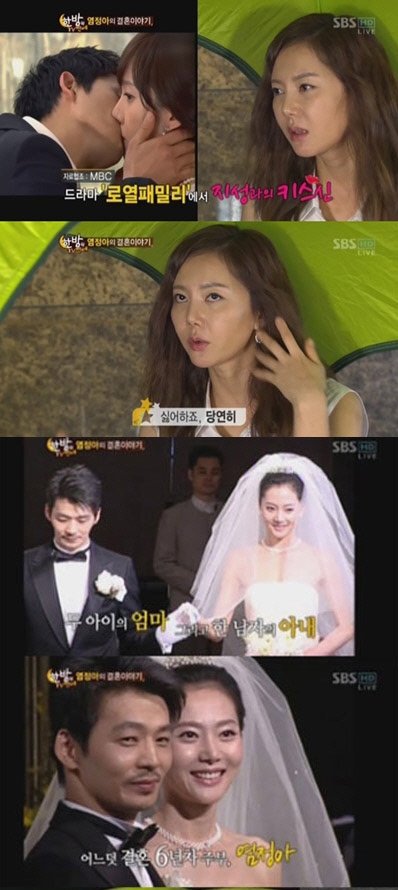이어 염정아는 "남편이 남자 배우들과의 키스신에 대해 어떻게 생각하냐"는 질문에 "당연히 남편은 싫어한다. 예전에 MBC '로얄패밀리'에서 지성과 키스했는데 남편이 못 보게 하려고 방송할 때 일부러 데리고 나갔다"고 답했다.