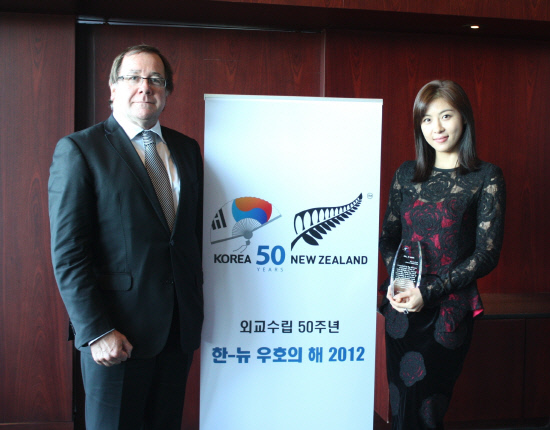 뉴질랜드 문화 홍보대사로 활동 중인 하지원이 한국과 뉴질랜드 외교 수립 50주년 기념 '2012년 한-뉴 우호의 해'를 맞아 감사패를 받았다.