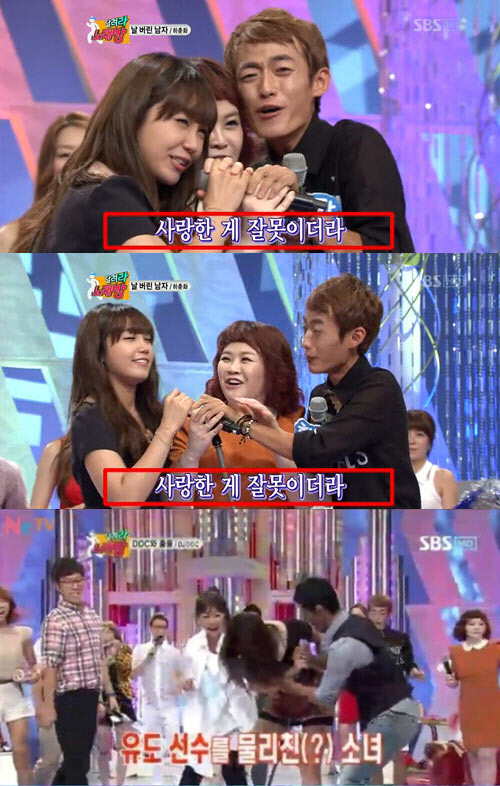 당시 가장 먼저 무대에 올라 마이크를 차지한 출연자가 노래의 후렴구를 부르는 게임이었는데, 정은지는 함께 출연한 개그맨 한민관이 노래를 부르고 있는 도중 마이크를 자신의 쪽으로 당겨서 불렀고, 이어 유도선수 조준호가 잡은 마이크를 뺏는 등 다소 과한 행동으로 시청자들의 눈을 불편하게 하며 비판의 목소리가 높아졌다.